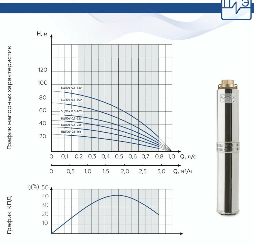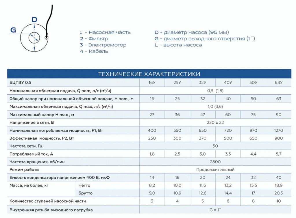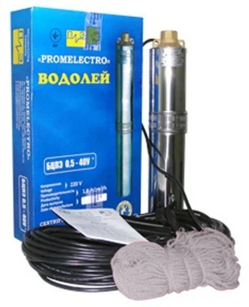 Погружной насос Водолей БЦПЭ 0,5-40У серии 0,5 отлично подойдет для подачи воды на бытовые нужды практически любого частного домовладения или коммерческого помещения. Данные насосы предназначен для подачи воды из открытых источников водоснабжения, будь то колодец или скважина с внутренним диаметром не менее 110 мм. Насосы Водолей БЦПЭ подходят для использования как в ручном режиме, так и автоматических системах, совместно с гидроаккулятором.Напор насоса БЦПЭ 0,5-40У составляет 40 м и может доходить в максимальном значении до 60 м, а номинальный расход всех насосов серии БЦПЭ 0,5 составляет 1,8 м³/ч.Насосы Водолей одни из самых востребованных погружных насосов на российском рынке, благодаря их высокой надежности, отсутствию необходимости проводить плановое техническое обслуживание, функциональности и доступной цене.